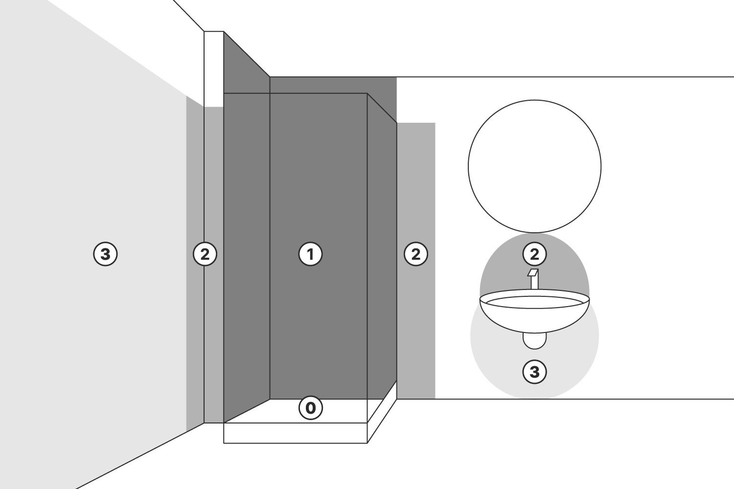 Vlhkost a elektřina nejdou spolu moc dohromady. A proto je nutné, aby svítidla instalovaná nad vanou či u sprchy měla vyšší stupeň krytí (označení IP) vůči vodě a vlhkosti. Ovšem ne všude v koupelně je u svítidel vysoký stupeň krytí potřeba - jak můžete vidět na obrázku.