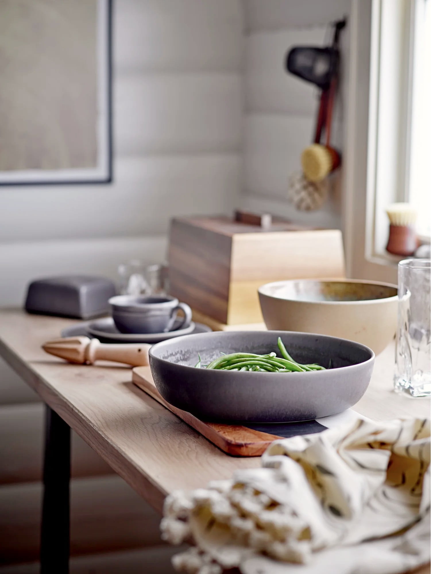 Tyto materiály dýchají — zjemňují prostor a krásně stárnou. Hledejte dřevěné komody s čistými liniemi, stoly v surovém provedení nebo tkané podlahové krytiny, které dodají teplo bez vizuálního nepořádku.