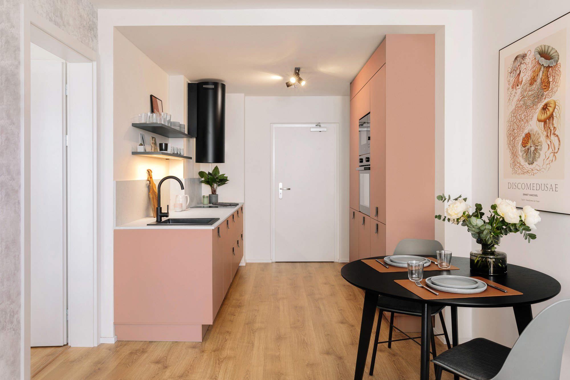 Od návrhu interiéru pro Skyline Chodov patřící společnosti PSN uběhlo pouhých pět týdnů a my prostíráme v nové kuchyni. Dlouho se v ní ale nezdržíme, protože vás chceme provést celým vzorovým bytem. Že se jedná o moderní bydlení pro mladé, napoví už barva roku 2024 Peach Fuzz, která celému interiéru vládne.