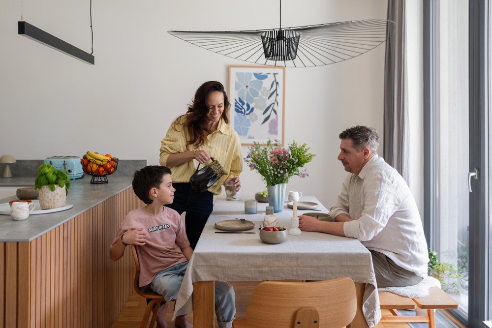 Rozhodně náš lustr. Vypadá trochu jako klobouk a dominuje celému interiéru. Je to přesně ten typ kousku, který buď miluješ, nebo nechápeš… já ho miluju, manžel ho dodnes nechápe.