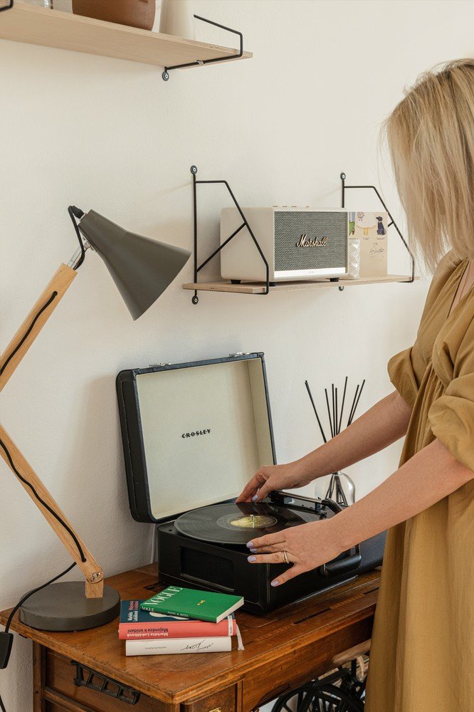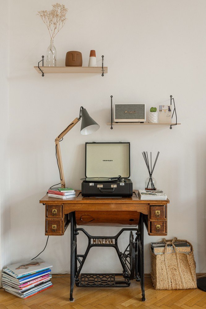 Domov je pro mě místo, který mám hodně spojený s rodinou. V bytě mi proto nechybí ani vintage kousky, třeba šicí stroj po babičce nebo zrcadlo. Z novějších prvků je to pak repráček Marshall nebo komoda od Teulat a knihovna plná kvalitních knížek, díky kterým si připadáme chytřejší.