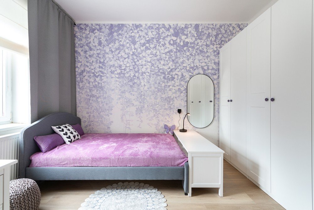 Ryze dívčí interiér podtrhla i vyvážená kombinace bílé s fialkovou, která místnosti s mohutnějšími kousky nábytku dodala na vzdušnosti.