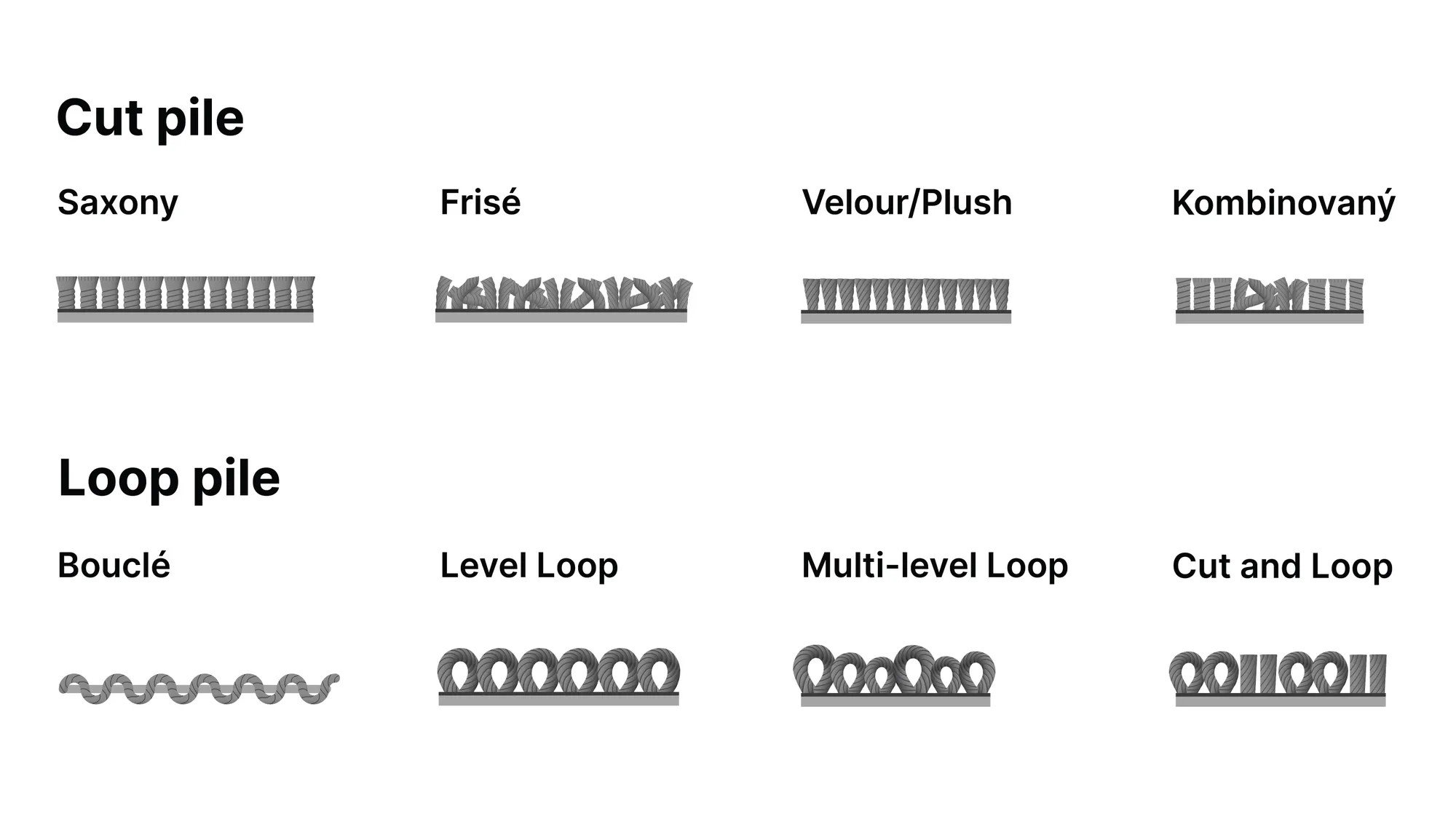 Velour/Plush: Hladký, měkký povrch, konce vláken jsou rozšířené a stojí různými směry. Koberec má bohatý, plyšový vzhled.