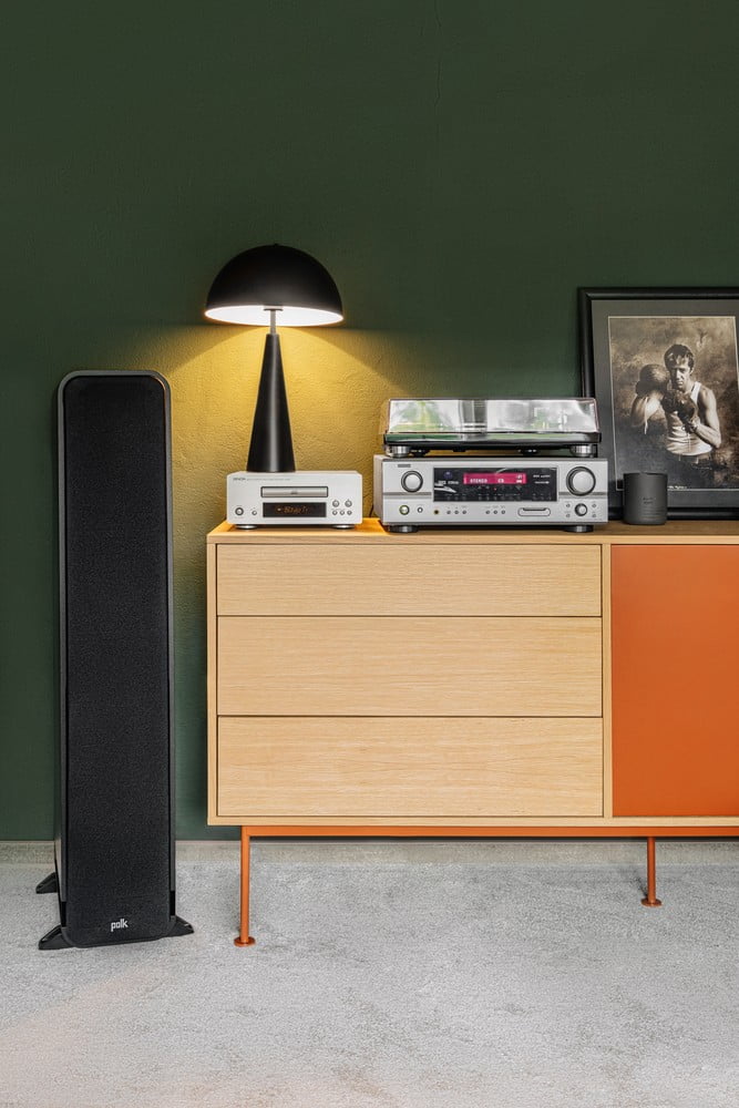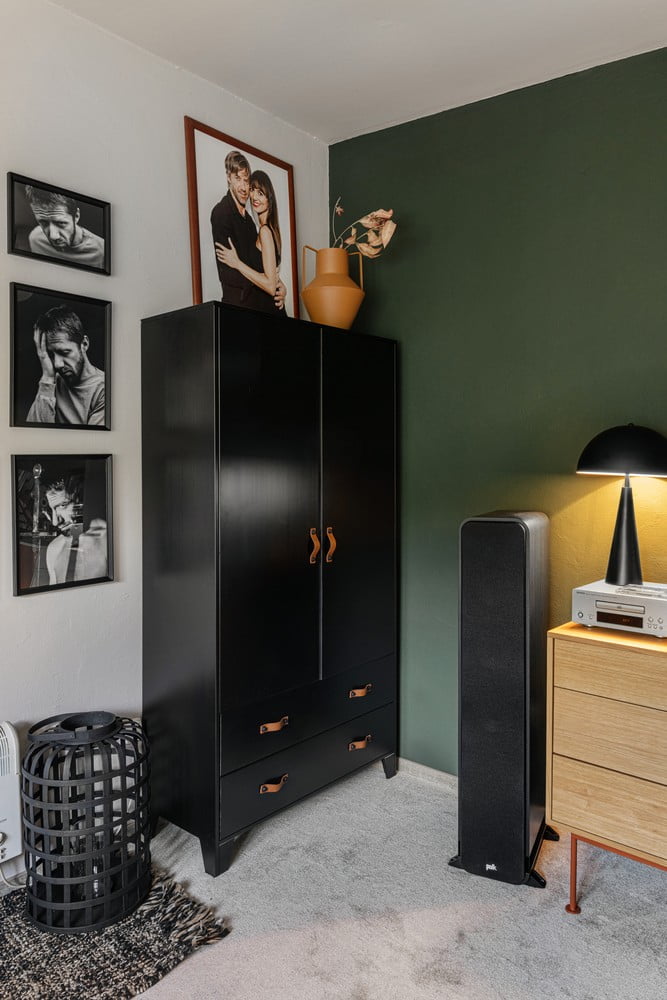 Největší pozornost jsem zaměřila na komodu pro gramofon. Celá tato stěna má sloužit zvuku a zároveň pojmout i velké množství gramodesek. Také je to na malém prostoru poměrně velký a výrazný kus nábytku.