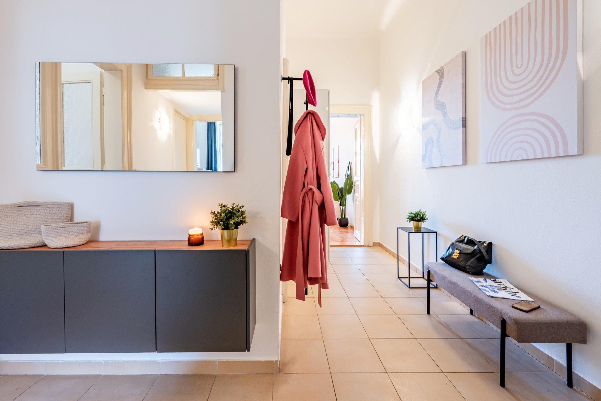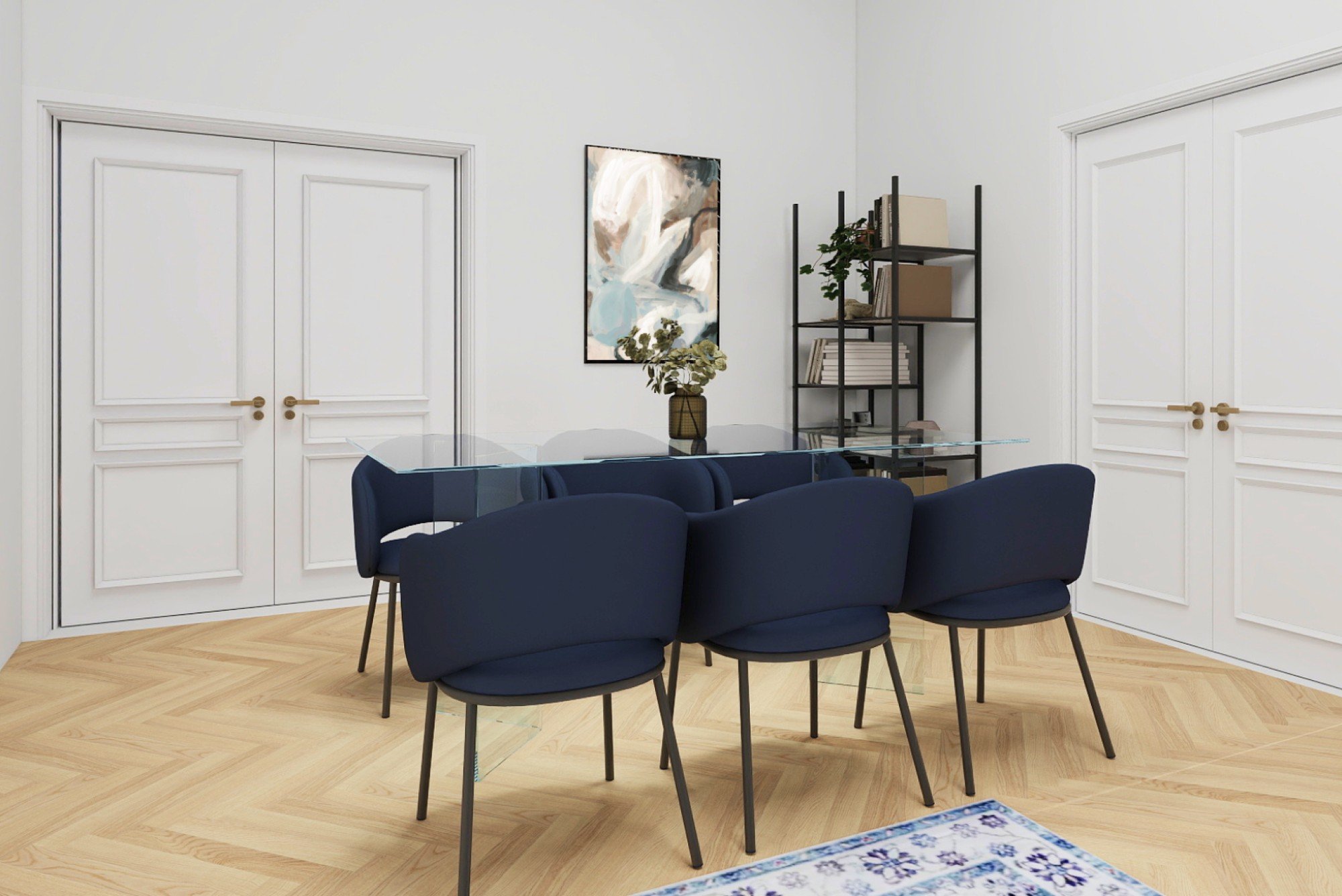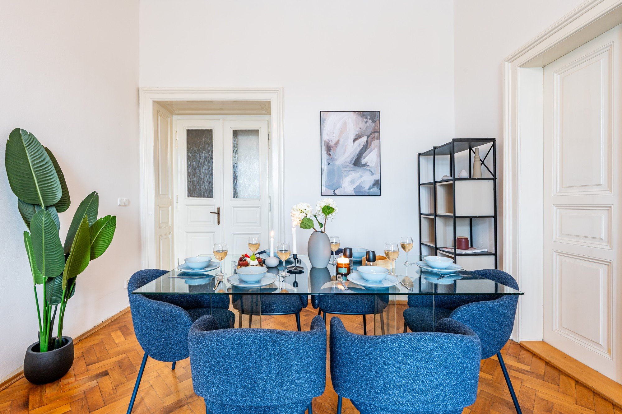Vzdušný byt v historickém domě spojuje velkorysé proporce s promyšlenými detaily. Vysoké stropy, původní parkety a kontrast tmavého dřeva s jemnými odstíny modré vytvářejí nadčasový interiér, který je klidný, elegantní a přirozeně útulný. Dispozice navržená pro každodenní život i společné chvíle dokazuje, že komfort a charakter mohou jít ruku v ruce.