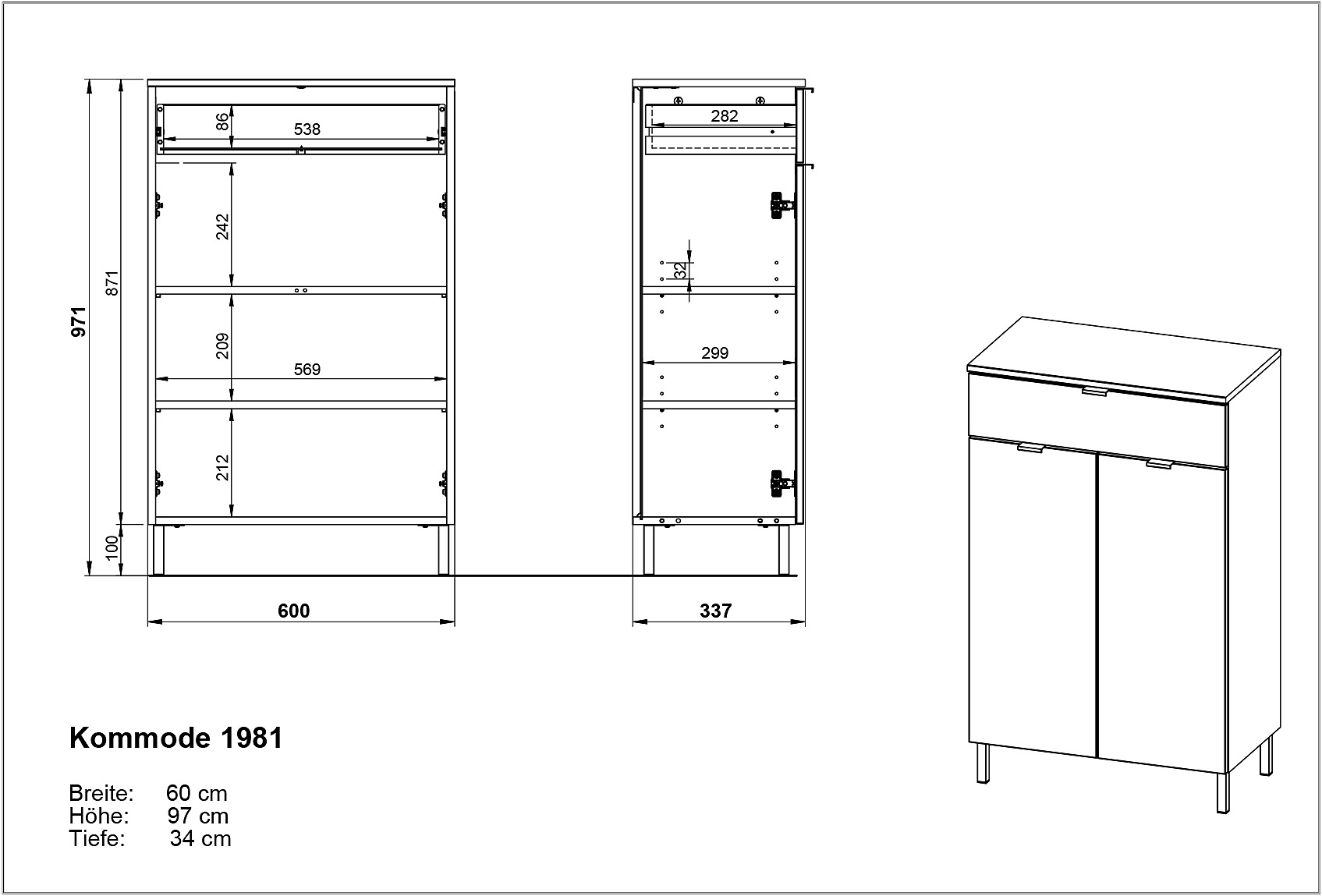 Skříňka je vybavena jednou zásuvkou s nosností do 10 kg a dvěma dvířky, za kterými se skrývají dvě nastavitelné police, každá s nosností do 10 kg.