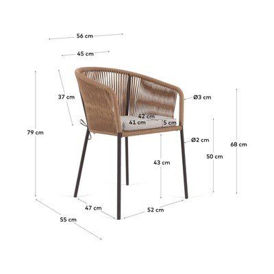 Židle Yanet od značky Kave Home dodá uvolněný vzhled jakémukoli prostoru, ať už ji využijete pro stolování doma nebo venku. Její sedák je ručně pletený z lana a doplněný o pohodlné polstrování. Kovová konstrukce zajišťuje stabilitu.