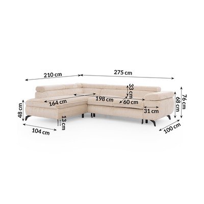 ManšestrováPolohovací/rozkládací/s úložným prostoremLevý roh/do LBéžováVhodné pro mazlíčky/odolné vůči skvrnámČtyřmístnáŠířka 275 cm