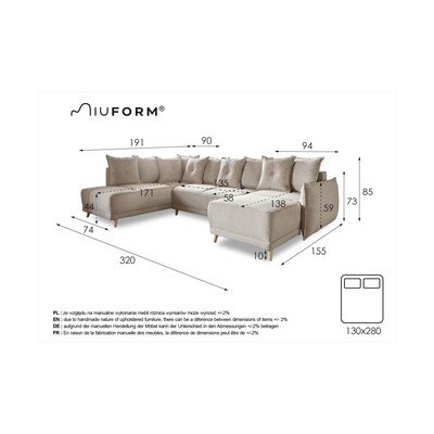 ManšestrováRozkládací/s úložným prostoremLevý roh/do "U"BéžováVícemístnáŠířka 320 cmHloubka 191 cmHloubka sedáku 58 cm
