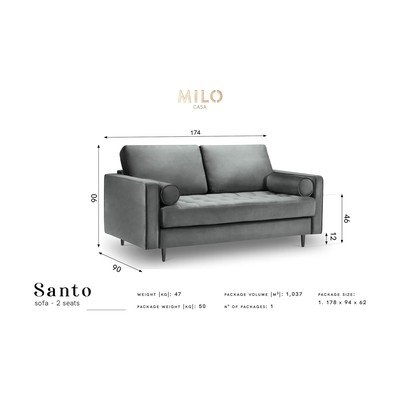 Sametová pohovka Santo s 2 dekorativními polštářky poskytuje skvělý odpočinkový prostor a dodává interiéru špetku designu a luxusu. Tkaniny, které značka Milo Casa používá, jsou podrobeny náročným testům, aby zaručily špičkovou odolnost, komfort i atraktivní styl. Na potah této pohovky byla tedy použita krásná látka s mírným leskem a krátkým vlasem, která je velmi příjemná na dotek a také velmi odolná proti oděru. Technika Liquid Blocked použitá na tkanině znesnadňuje vstřebávání tekutin, tedy způsobuje, že se tekutina shromažďuje na povrchu materiálu, aniž by pronikla hluboko do vláken. Díky tomu se káva, čaj nebo víno nalité na látku odstraní během pár sekund přiložením lehce savého hadříku nebo papírové utěrky.