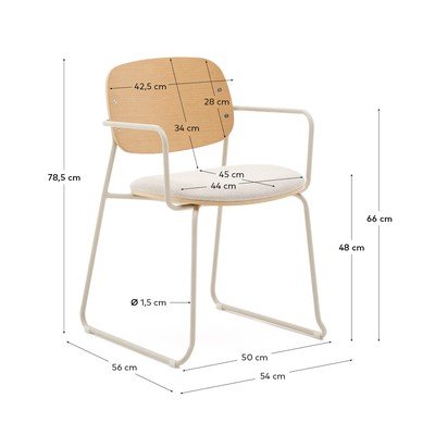 Konstrukce židle, včetně područek a nohou, je z mikrotexturovaného kovu. Látka sedáku se pyšní certifikací OEKO-TEX® STANDARD 100, která zaručuje ekologicky šetrnou a zodpovědnou výrobu. Dřevo použité na židli má certifikaci FSC Mix Credit, což znamená, že pochází ze směsi materiálů z certifikovaných lesů a kontrolovaného dřeva. Pro ochranu podlahy jsou nohy židle opatřeny speciálními chrániči.