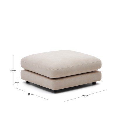 Podnožka Gala od značky Kave Home. Měkká výplň s efektem peří zaručuje obklopující pohodlí a potah s úpravou proti skvrnám usnadňuje údržbu.