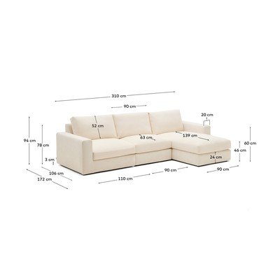 ŽinylkováPravý roh/s lenoškouSe snímatelným potahemBéžováČtyřmístnáŠířka 310 cmHloubka 172 cmHloubka sedáku 63 cm