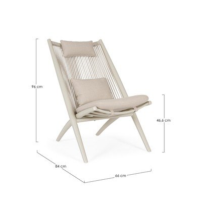 Zahradní křeslo Aloha od značky Bizzotto. Jeho konstrukce s provazovým výpletem a pohodlnými polštáři vybízí k relaxaci venku.