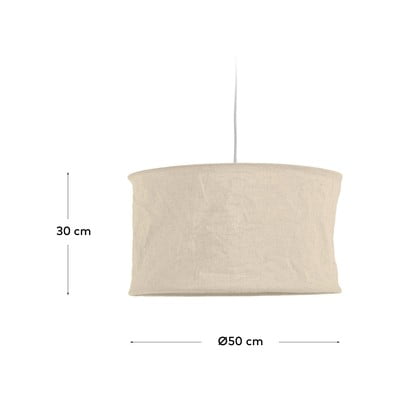 Béžové stínidlo Mariela o průměru 50 cm od značky Kave Home je vyrobeno ze lnu a má vnitřní kovovou konstrukci. Pro montáž je nutné dokoupit závěsný kabel, skvěle bude ladit s kabely z kolekce Fulvia a Kaede.