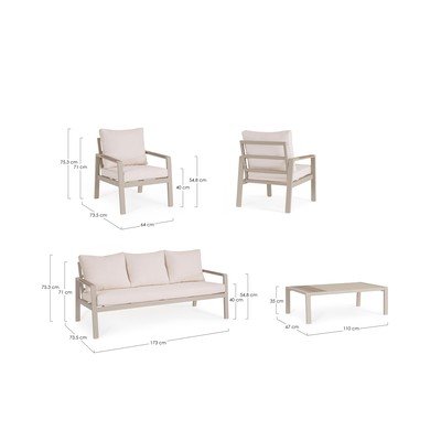 Konstrukce celého setu je vyrobena z hliníku, doplněná o měkké polstrování pro pohodlí. Pohovka má rozměry 173 x 73,5 x 75,5 cm, s výškou sedu 40 cm a výškou područek 54,8 cm.