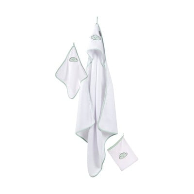 Všechny kousky jsou vyrobeny z kvalitní a k pokožce šetrné froté bavlny. Osuška s kapucí je praktická a roztomilá zároveň a jemný motiv obláčku dodává sadě hravý vzhled.