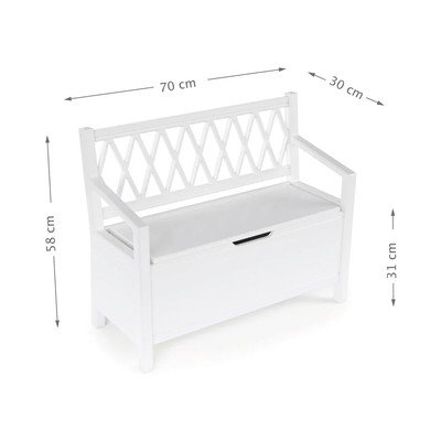 Tento kousek nábytku se pyšní propracovanými detaily, které svědčí o vysoké úrovni řemeslného zpracování. Pod sedákem se skrývá praktický úložný prostor, ideální pro uložení hraček a dalších drobností. Sedák je navržen s hladkým zavíráním, které zajišťuje bezpečnost a chrání malé prsty před přiskřípnutím.