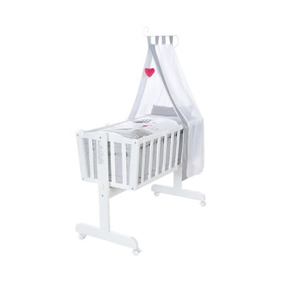 Součástí sady je matrace, hnízečko, nebesa s držákem a sada koleček s brzdami. Potah matrace i polštářku (40 x 35 cm) a peřinka (80 x 80 cm) jsou vyrobeny ze 100% bavlny. Výplň dětské přikrývky tvoří prodyšné a teplotně regulující klimatické vlákno.