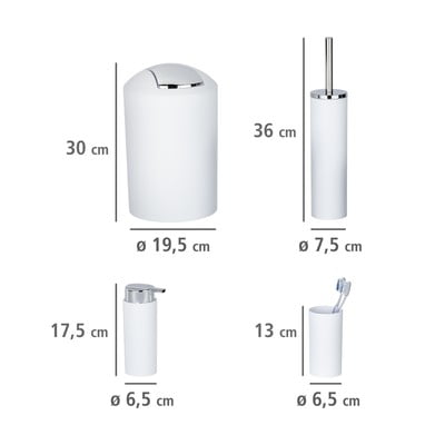 V sadě najdete kelímek na zubní kartáčky, dávkovač mýdla s pumpičkou, odpadkový koš s objemem 6,5 litru a praktickou výklopnou klapkou pro snadné vyprazdňování, a také WC sadu s kartáčem a vyměnitelnou hlavicí o šířce 6,5 cm. Kartáč má flexibilní plastové štětiny, které účinně čistí a nepoškrábou toaletní mísu.