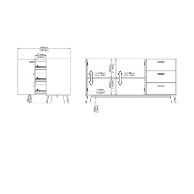 Dvě uzavřené skříňky s nastavitelnými policemi a tři zásuvky poskytují dostatek úložného prostoru. Moderní, minimalistický design s lehce zkosenými nohami se skvěle hodí do současných interiérů.