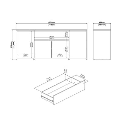 S rozměry 197x84x48 cm nabízí dostatek místa pro vaše věci. Komoda má čtyři uzavřené prostory s policemi a praktickou zásuvku. Bílá barva v kombinaci s dekorem dubu vytváří elegantní vzhled. Dvě velké skříňky po stranách a dvě menší uprostřed poskytují variabilní možnosti ukládání.