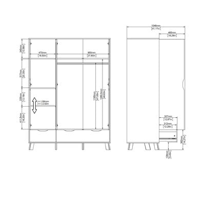 Tato prostorná skříň v bílo-dubovém provedení nabízí tři dveře, z nichž jedna je vybavena zrcadlem. Uvnitř najdete dvě nastavitelné a dvě pevné police a tyč na oblečení. Ve spodu skčíně jsou umístěny tři prostorné zásuvky. S rozměry 147x201x58 cm poskytuje dostatek úložného prostoru pro vaše oblečení a doplňky.