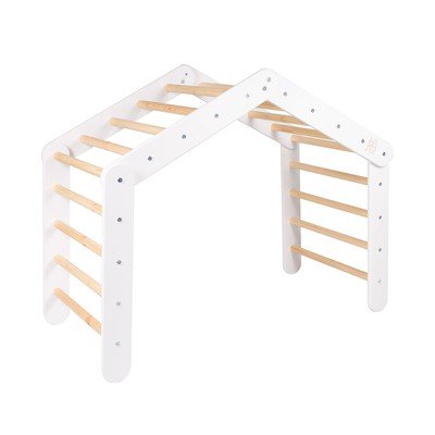 Montessori pikler trojúhelník od značky Meowbaby. Jeho modulární design umožňuje sestavit buď jeden velký domeček, nebo dva menší žebříky pro variabilní hru.