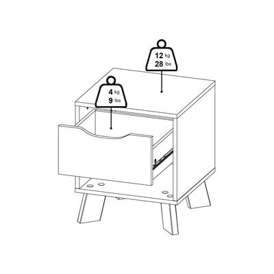Praktická zásuvka s výřezem pro snadné otevírání poskytuje úložný prostor, zatímco otevřená police pod ní nabízí místo pro dekorativní předměty nebo knihy. Stolek stojí na čtyřech šikmých nohách, které mu dodávají stabilitu a elegantní vzhled.