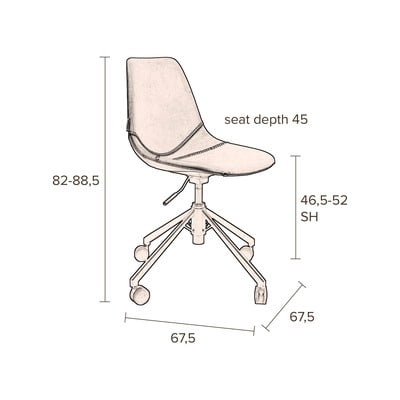 Výšku sedu lze nastavit v rozmezí 46,5 - 52 cm, přičemž celková výška židle bude sahat od 82 do 88,6 cm.
