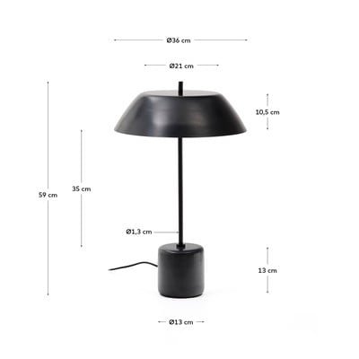 Stolní lampa Sayra od značky Kave Home vnese do vašeho interiéru minimalistickou eleganci. Lampu tvoří jkovové stínidlo v černé barvě, které je usazeno na štíhlé tyči. Stabilitu lampě dodává kulatá základna z černého mramoru, díky kterému je každý kus originálem s jedinečnou kresbou a texturou.