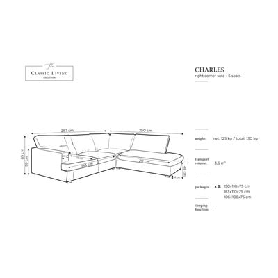 Levý rohČernáČtyřmístnáŠířka 287 cmHloubka 250 cmHloubka sedáku 66 cm