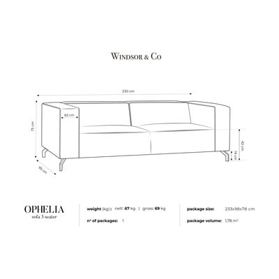 ČernáTrojmístnáŠířka 230 cmHloubka 95 cmHloubka sedáku 59 cm