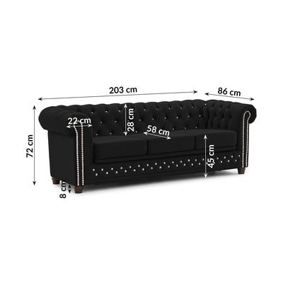 Sametová, rozkládací, chesterfield, černá, voděodolná/odolné vůči skvrnám, dvoumístná, šířka 203 cm
