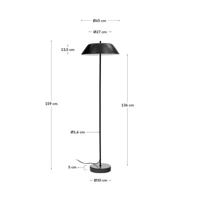 Stojací lampa Sayra od značky Kave Home vnese do vašeho interiéru minimalistickou eleganci. Lampa je vysoká 153 cm a tvoří ji kovové stínidlo v černé barvě, které je usazeno na štíhlé tyči. Stabilitu lampě dodává kulatá základna z černého mramoru, díky kterému je každý kus originálem s jedinečnou kresbou a texturou.
