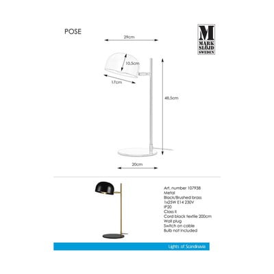 Stolní lampa PoseS kovovým stínidlem, kovová, do zásuvky, černá/ve zlaté barvě, výška 49 cm