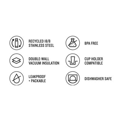 Lahev je vyrobena z recyklované 18/8 nerezové oceli a má dvoustěnnou vakuovou izolaci, takže udrží nápoj studený až 6 hodin a teplý až 4 hodiny (led až 11 hodin). Kompatibilní se všemi automobilovými držáky.