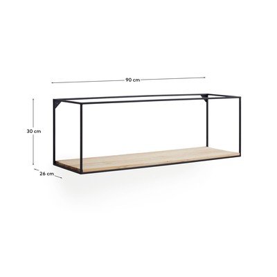 Police Elisha od značky Kave Home. Otevřená černá kovová konstrukce s deskou z přírodního jedlového dřeva poskytuje vzdušný prostor pro vystavení oblíbených předmětů.