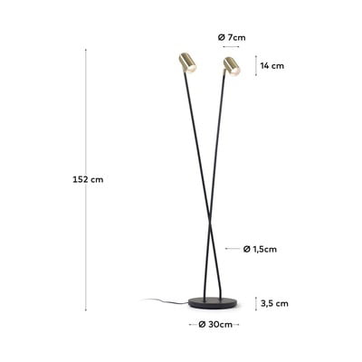 Stojací lampa Clemence od značky Kave Home zaujme elegantním kontrastem černé kovové konstrukce a dvou mosazných stínidel. Je vysoká 152 cm a je vybavena dvěma kloubovými stínidly, která umožňují nasměrovat světlo podle potřeby. Lampa je kompatibilní s LED žárovkami typu E27 s maximálním výkonem 3 W.