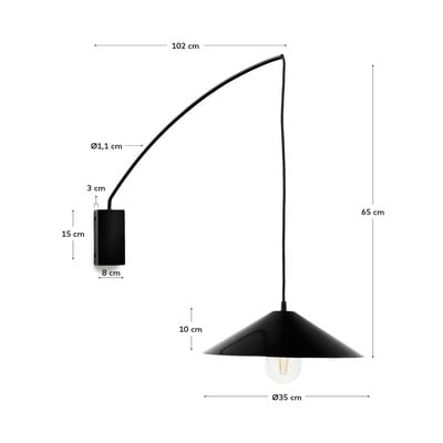 Nástěnné svítidlo Kally od značky Kave Home je ideálním doplňkem pro ty, kteří hledají originální a stylové osvětlení. Svítidlo je vyrobeno z kovu a zaujme svým netradičním tvarem s kónickým stínidlem zavěšeným na textilním kabelu. Pro použití je potřeba dokoupit žárovku s paticí E27 o maximálním výkonu 40 W.