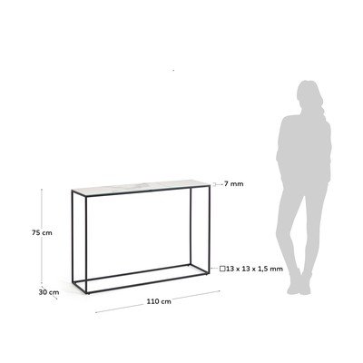 Konzolový stolek Rewena od značky Kave Home. Keramická deska je odolná vůči tekutinám, vysokým teplotám a opotřebení, navíc má praktické chrániče na nohou proti poškození podlahy.