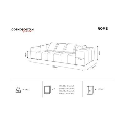 Objevte kombinaci funkčnosti a elegance a vyberte si z mnoha barevných variant pohovky Rome Velvet. Pohovka je sestavena z několika obdélníkovýchčtvercových modulů, zádových opěrekpodruček, které si můžete zakoupit i samostatně a vytvořit si tak svůj vlastní kousek, který bude vyhovovat jak vašim potřebám, tak vašemu interiéru. Z modulů si můžete sestavit menší či větší pohovku, rohovou pohovku, nebo dokonce pohovku do “U”. Velkou variabilitu řada Rome Velvet představuje i v nabídce polštářů v mnoha velikostech a barvách, kterými dodáte pohovce útulnější nádech a také komfort ve formě sametového povrchu, který zdobí jak polštáře, tak i pohovku. Vyzkoušet můžete i látkovou verzi pohovky Rome.