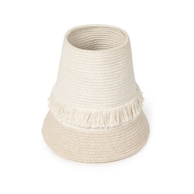 Pletená šňůra je vyplněna vlákny z recyklovaných PET lahví, obarvená a smíchaná s bavlnou, což koši dodává strukturu a odolnost.