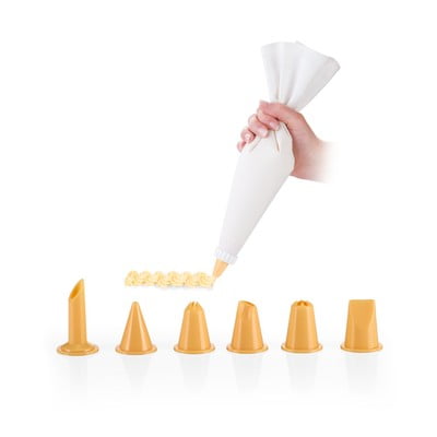 Ideální pomocník pro dekorování a plnění pokrmů. Vyrobeno z kvalitního neprosakujícího bavlněného plátna a odolného plastu. Před prvním a po každém použití umyjte sáček i trysky pod tekoucí vodou, trysky jsou vhodné do myčky.