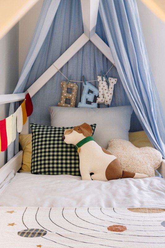 Dětská girlanda Betia od značky Kave Home. Díky svým bavlněným praporkům je ideální pro vytvoření hravého prostoru plného fantazie.