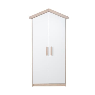 Moderní šatní skříň má jedinečný design domečku a skvěle se tak hodí do každého dětského pokoje. Nadčasová kombinace korpusu v kvalitním dubovém dekoru s elegantními bílými dvířky a masivní zaoblené úchytky harmonicky zapadne do různých stylů interiéru.