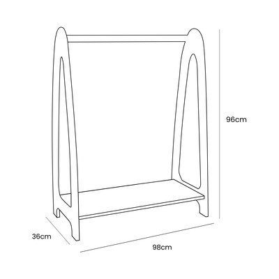 Dětský věšák Montessori od značky Meowbaby. Jeho otevřená konstrukce s tyčí a spodní policí podporuje samostatnost dětí při ukládání oblečení.