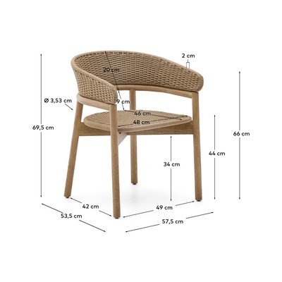 Zahradní židle Arinella od značky Kave Home. Její konstrukce z masivního akáciového dřeva a ručně pletený sedák z lana jsou vhodné pro použití v interiéru i exteriéru.