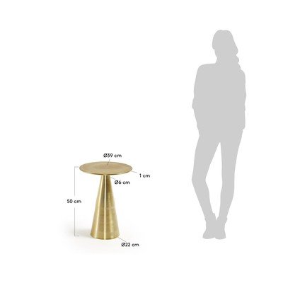 Odkládací stolek Rhet od značky Kave Home je vyroben z kovu. Jeho design s kulatou deskou a kónickou základnou vnese do interiéru moderní a elegantní prvek. Pro ochranu vaší podlahy je stolek vybaven praktickými gumovými chrániči.