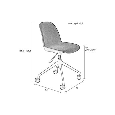 Kancelářská židle Albert od značky Zuiver má jednoduchý design, který skvěle zapadne do jakékoliv kanceláře. I té u vás doma. Navíc má nastavitelnou výšku sedáku od 47,7 do 51,7 cm, takže si výšku židle přizpůsobíte svým potřebám. Opěradlo je pevné, bez možnosti aretace.